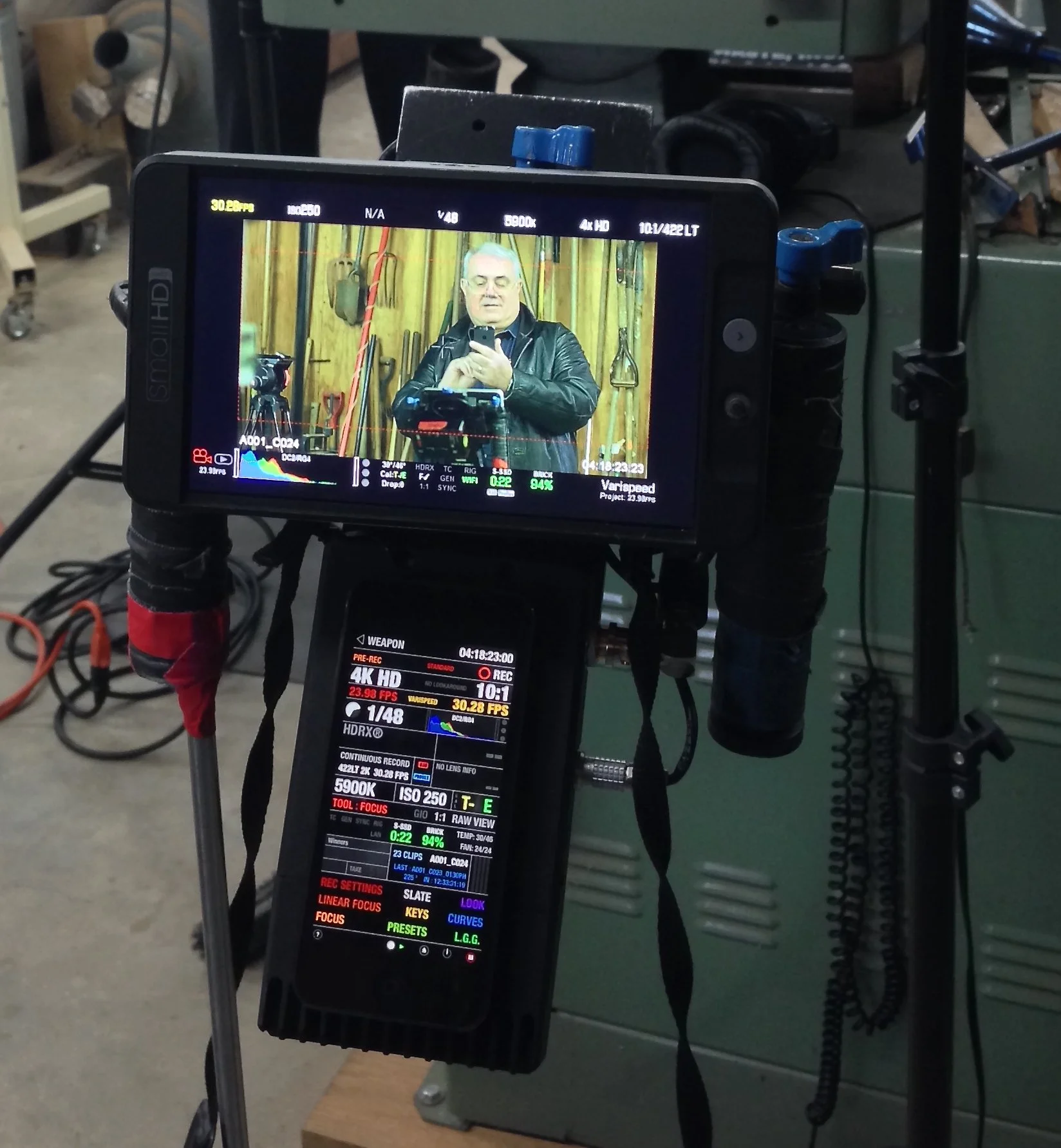 My job was directing the interview and sound capture. I used this rig to monitor what Rick Delgado was filming and all the settings used in the RED Weapon. You can see me in the Small HD monitor as Rick sets up a shot.