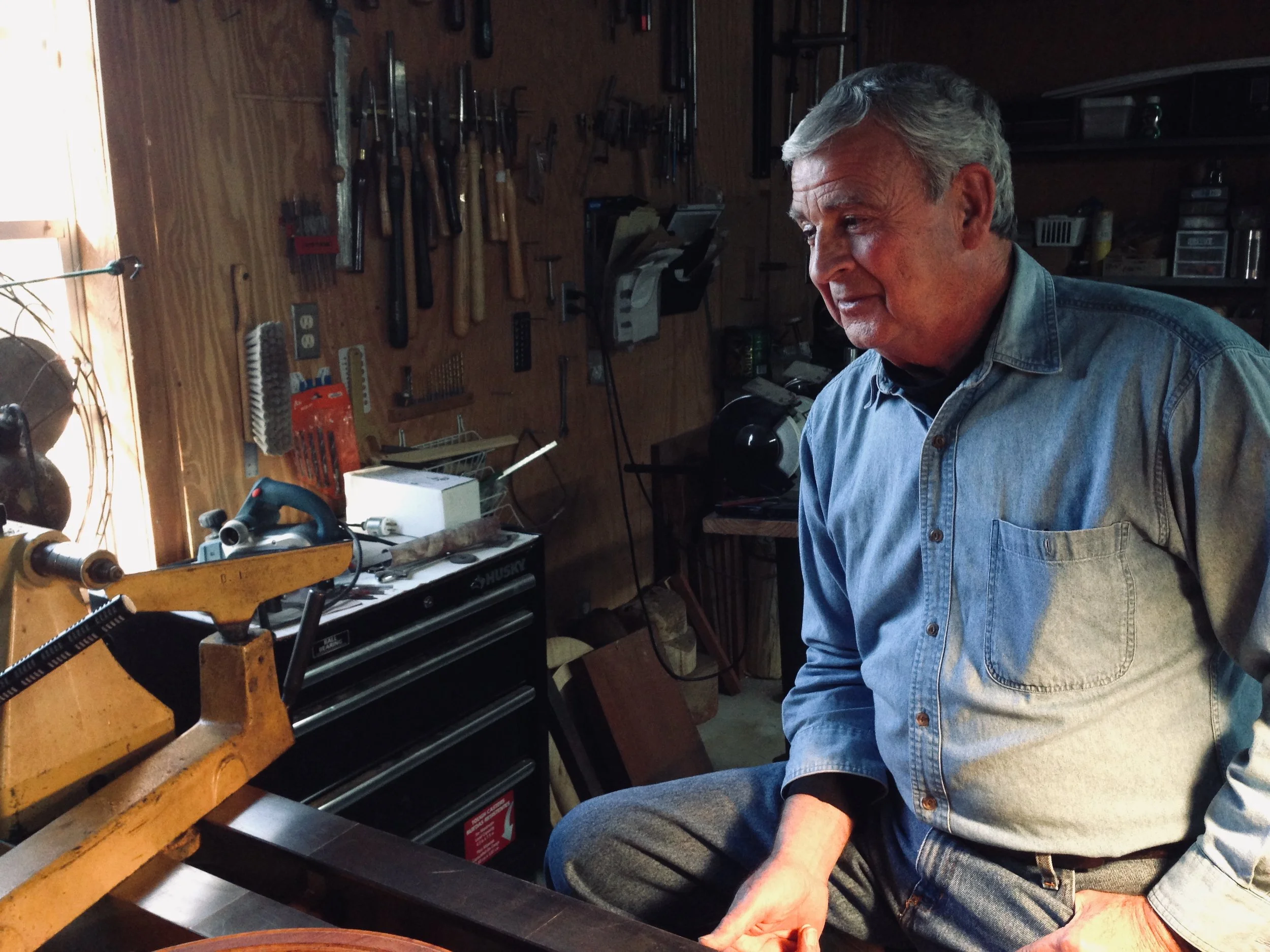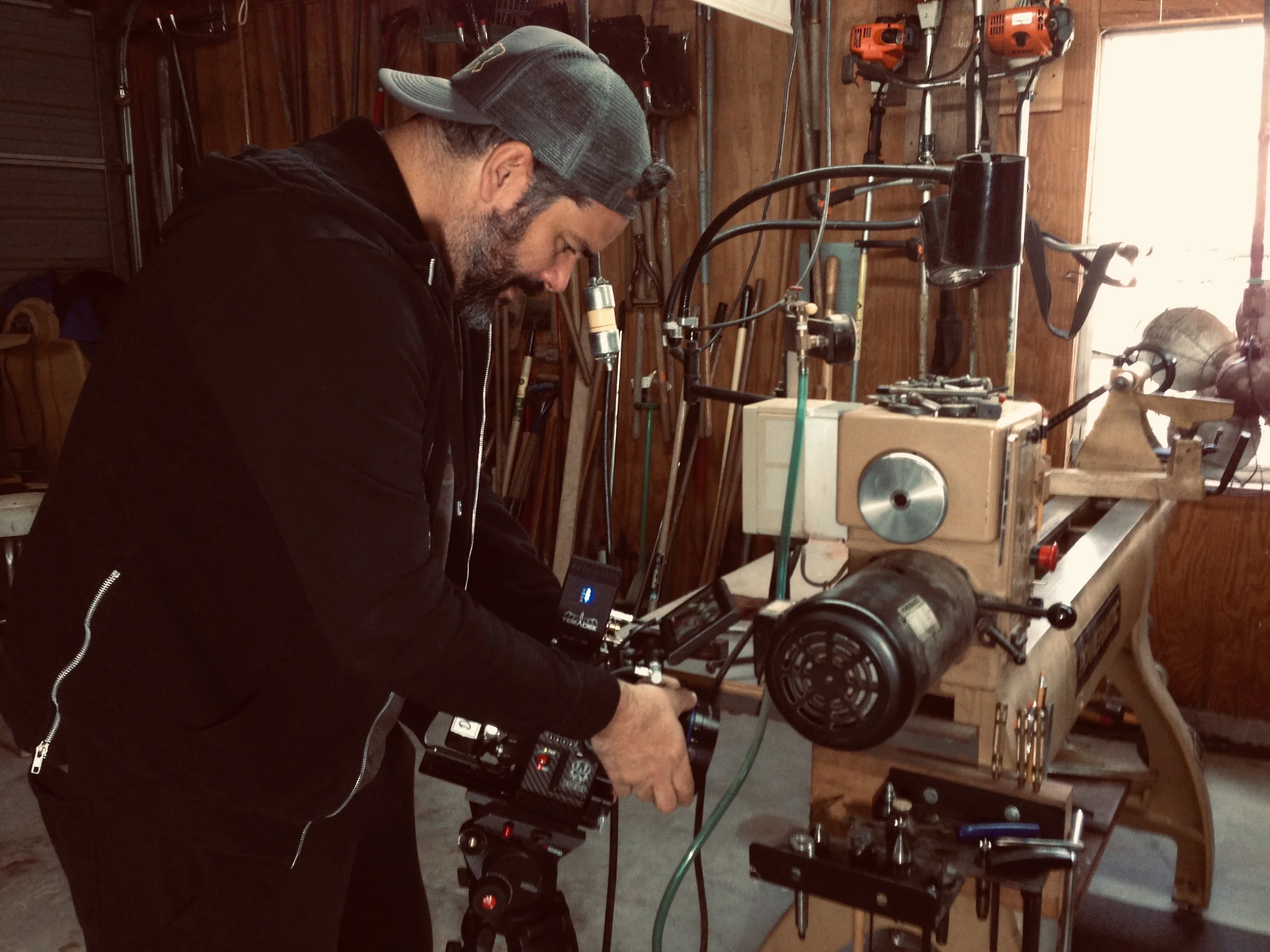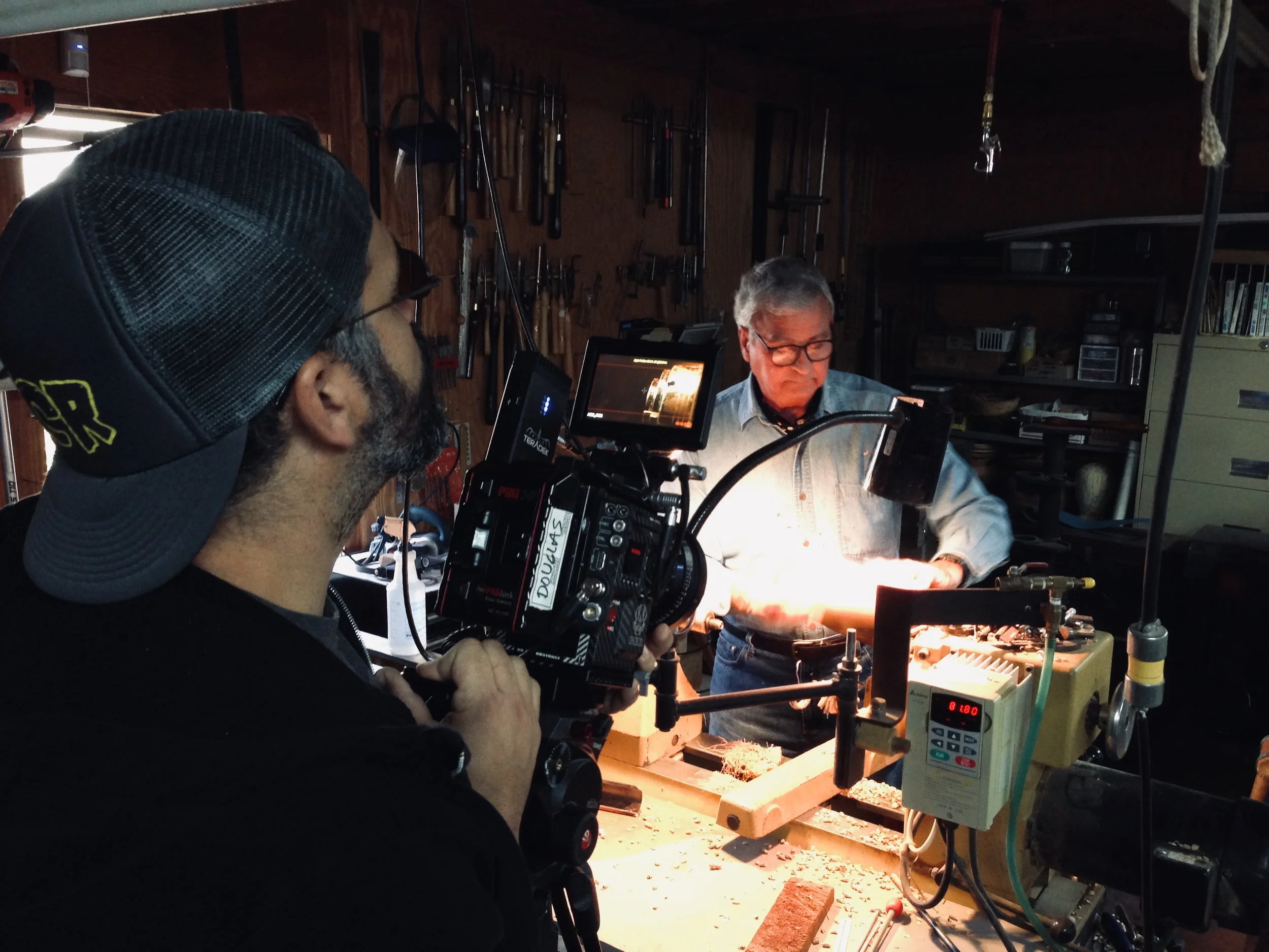 RIck Delgado is behind the camera filming wood-turning artisan Danny McCravy in his workshop.