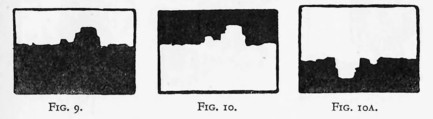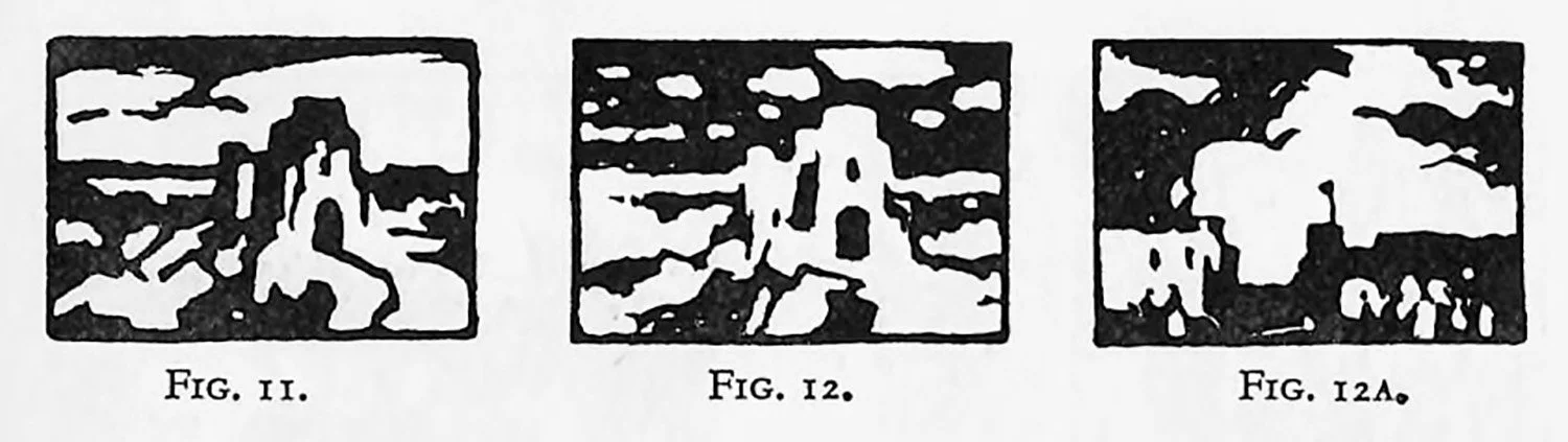 In pictorial work interchange is not quite so evident owing to the complexities of form, but it remains, nevertheless, a very active factor. In illustrations Figs. 9, 10 and I0A, a rectangle is shown with one portion dark and the other light, which, pictorially considered, might represent sky and earth. It is monotonous and lacking in distribution, but if some of the dark be transferred to the light area, and vice versa, the rectangle gains both variety and distribution, as in Figs. 11, 12 and 12a.