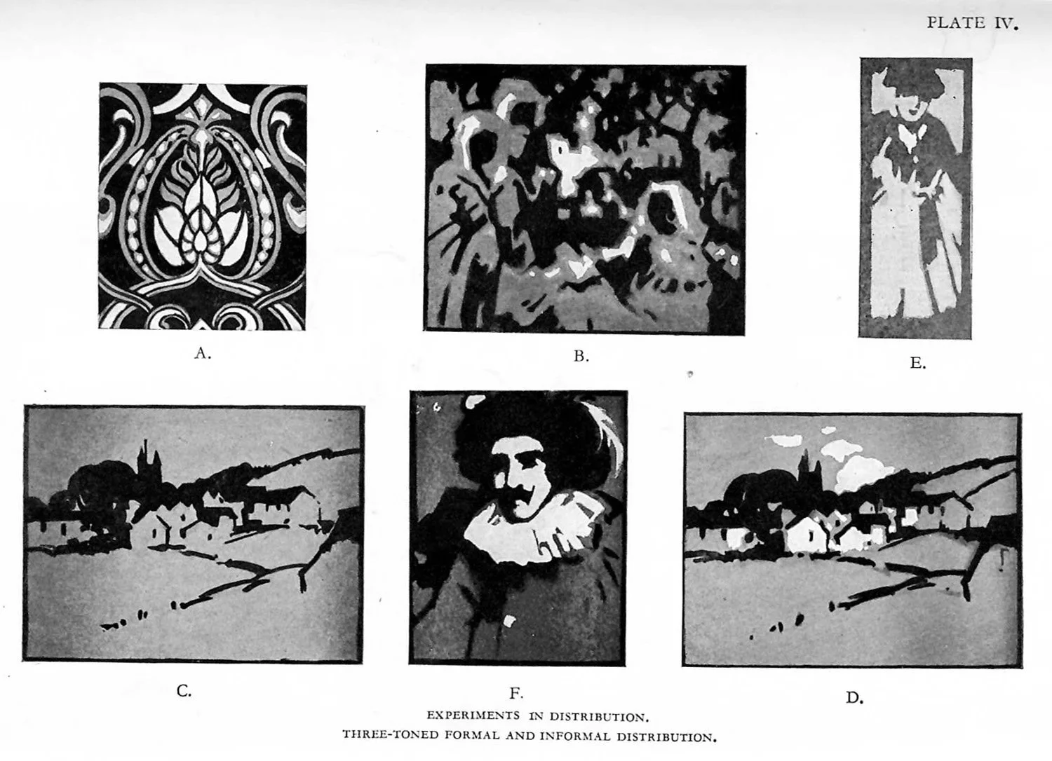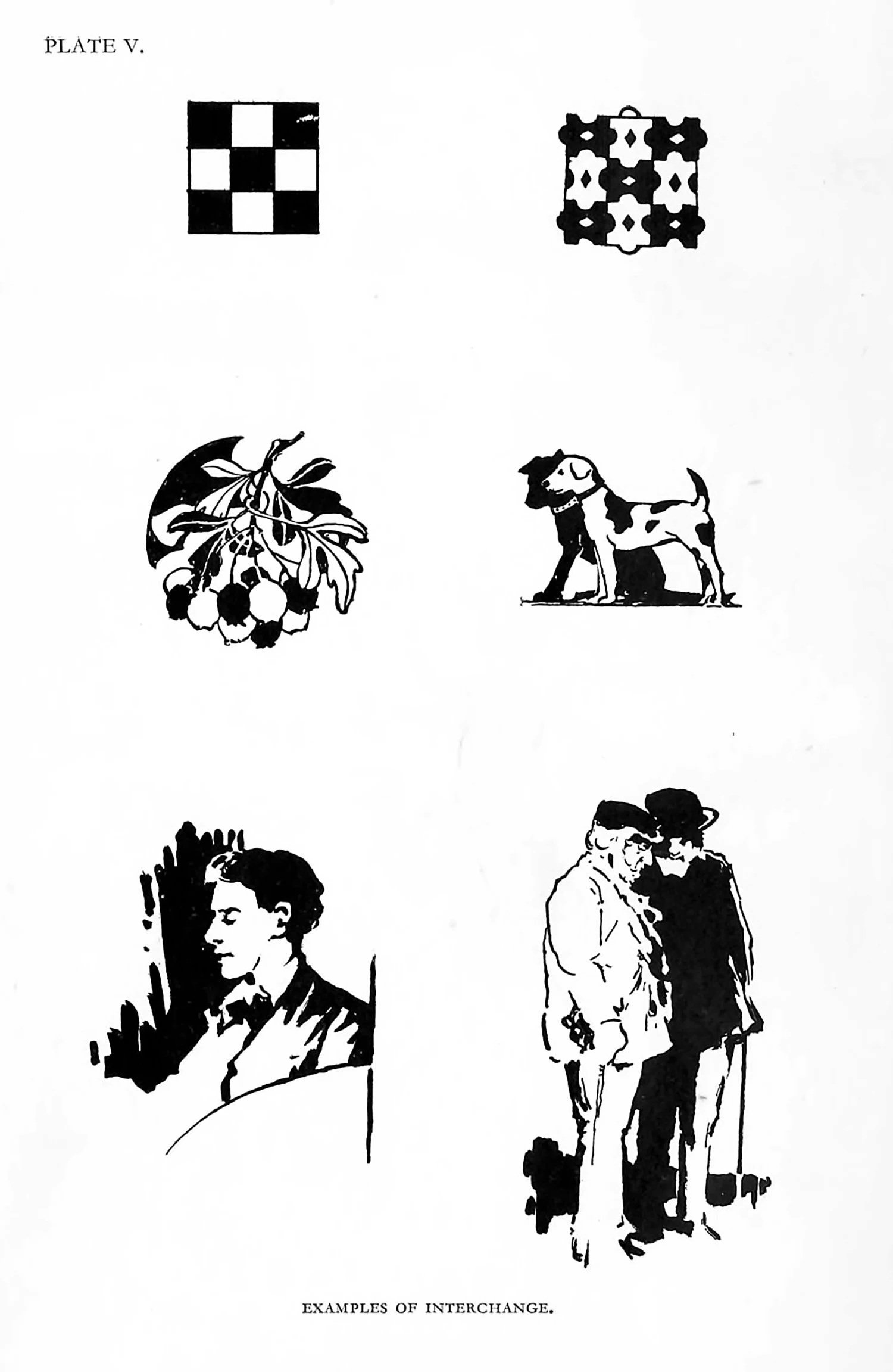 If we take the outlines of a couple of leaf-forms or animal-forms, arranging the tones so that one leaf is white with black veins and the other black with white veins—the animals to have white spots on a dark coat with a white background and black spots on the white coat with a black background—it will be seen that interchange provides a very ready means of introducing variety of tones with similar shapes. The illustrations given on Plate V demonstrate the principle from strictly formal designs to ornamental motives borderingon the pictorial.