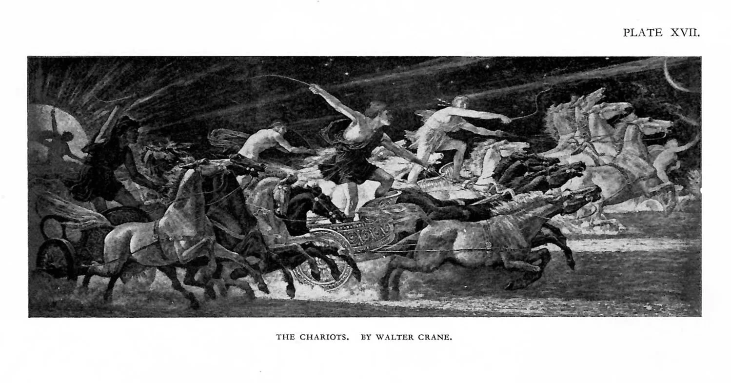 It is an excellent, and at the same time amusing, exercise for a number of students to try to draw a running figure. The winning example—the figure conveying the sense of greatest speed—is usually worthy of study in connection with directional lines. If we extend our inquiry a little farther and consider two or more figures are engaged in some common activity, such as digging, swimming, and so forth, we shall find that reiteration of movement gives emphasis; it does not increase the actual movement. The boat-race is an example of emphasis of movement, but the number of oarsmen does not give a greater average movement. When two people are opposed to each other, as in wrestling or boxing, we find the visual movement (that is, the impulse) greatest when one of them gains the ascendancy, temporary or otherwise.