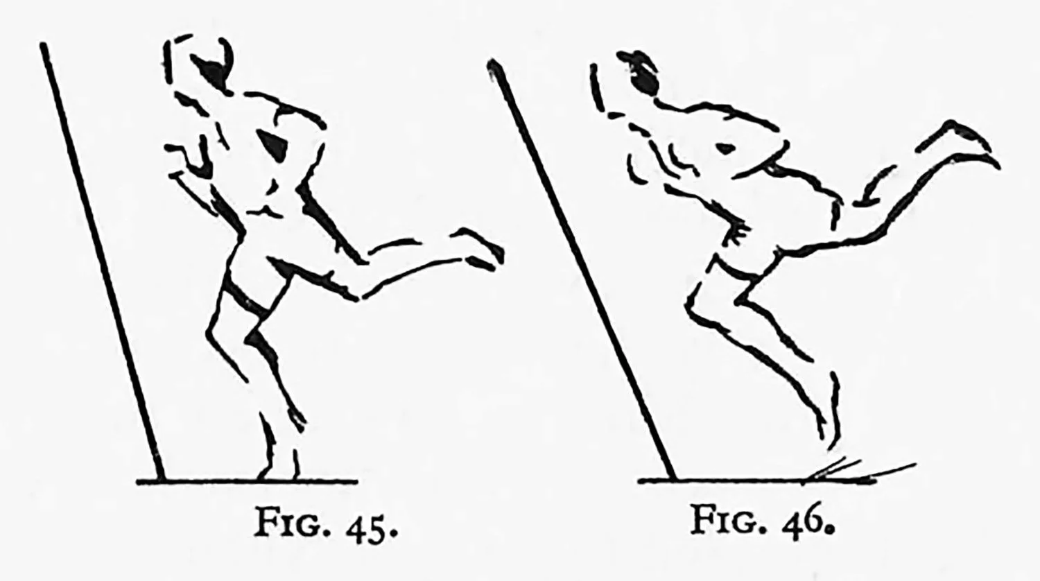 In such examples as Figs. 43 and 44 the walking figure must not have the average of the vertical example or the drawing will not suggest movement. Such a drawing must accentuate the diagonals in the required direction, and the lines that might counteract must be quietened.