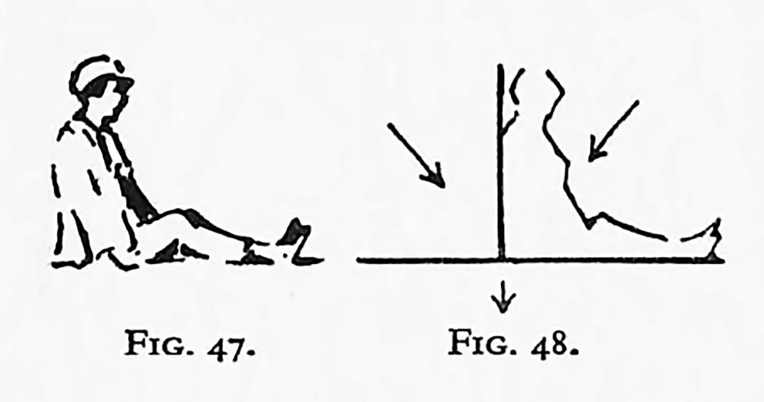 Before an analysis is made of Figs. 45 and 46, it will be clear that Fig. 46 expresses more movement. In Fig. 45 the main tendencies of line cancel out to some extent, but in Fig. 46 the average gives quite a definite slope. The horizontal line of the ground must always be considered as continuous, in which case it cancels out. If this is not understood the student may one day be confronted with a figure as shown in Fig. 47 and asked why the maximum movement has not been attained. The second diagram (Fig. 48) explains the difficulty.