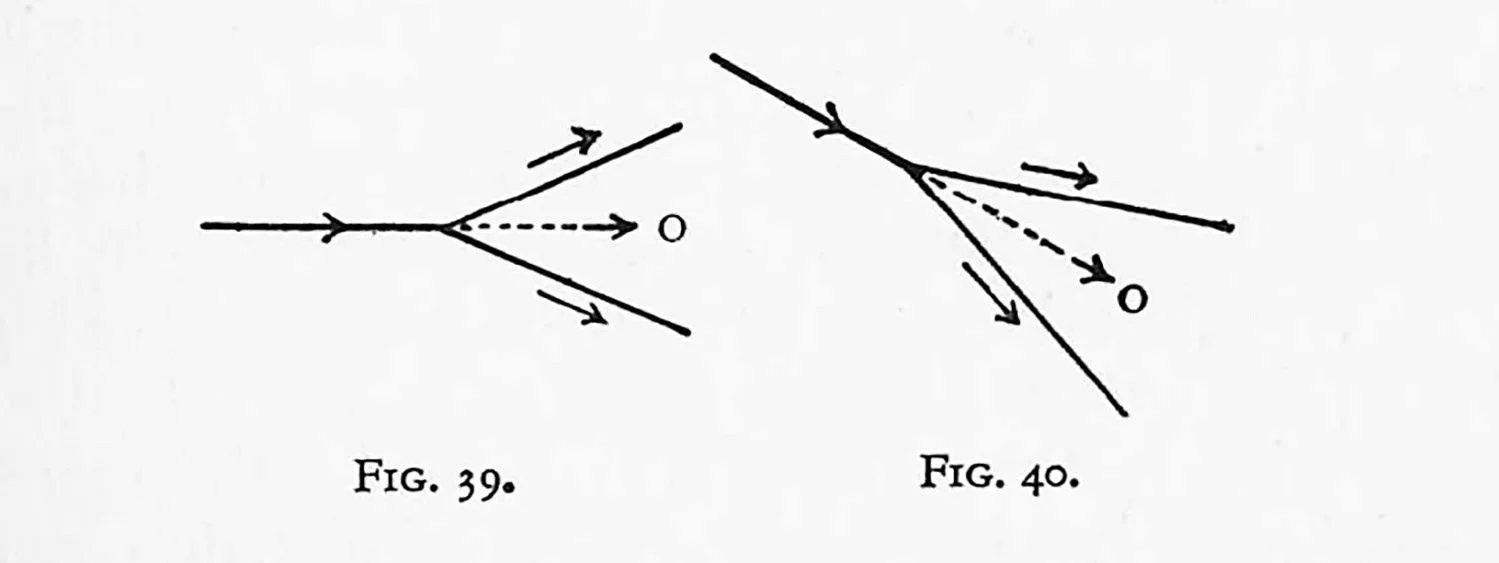 In Figs. 39 and 40, if equal forces are acting—“pulling”—in the direction shown by the outer arrows, the resulting direction of the combined forces will be O. O is the average direction (and when we speak of direction of line in pictorial composition it is the average that we have to deal. with). A pyramid or a gable, in spite of its diagonal lines, is, in consequence, a static form, and does not give a feeling of movement.