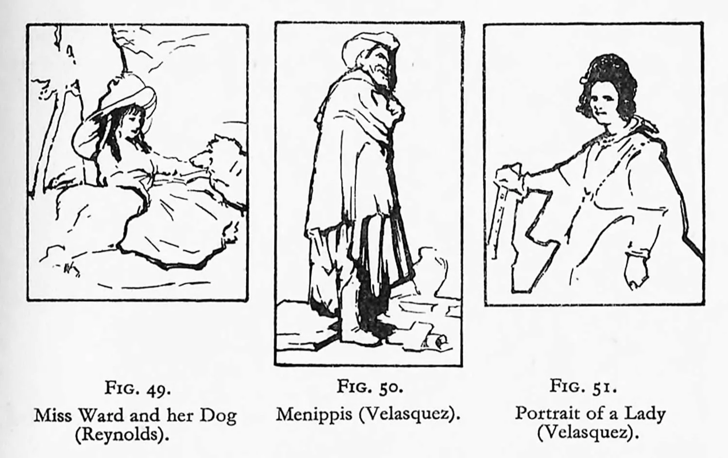 In the illustrations, Figs. 49, 50 and 51, we find that although the lines, when analysed, give verticality, yet the variety of line-direction takes away our attention from such a condition and gives vitality. It is at this point that the casual observer is inclined to think that these things were drawn in such a manner “because they were so!” Yes, there is little doubt that the sitters had vitality, but most teachers are aware of the fact that in a life-class, although the model has similar vitality or variety in any so-called static pose, the drawings all have the tendency to become less energetic—ie. more horizontal and vertical—as the work proceeds. It is so with the picture. To start with a few energetic lines is one thing, but it is quite another to complete the work whilst retaining them.