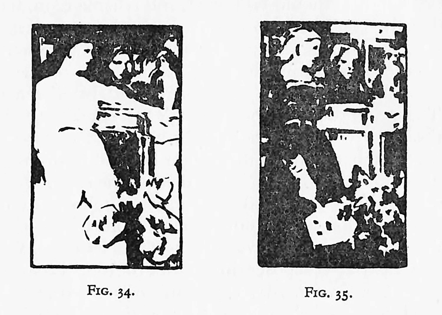 A very interesting and useful exercise is to select a picture with good distribution; then, on grey paper, draw two rectangles of the same proportion as the selected picture. Within these rectangles draw the key lines—the boundaries of the tones. In the first put down the darks and lights as they are in the original picture—simplified, of course; in the other rectangle put down a black in one of the larger areas that is white in the selected picture. Now attempt to solve the new distribution whilst still retaining the shapes. The absolute reversal of the tones is not required, for a face area, or hands, or any other object that one feels should remain light can be made so in both examples. If this second attempt in any way rivals the first, progress is being made. Such an exercise (shown in Figs. 34 and 35) will effectually put out of action any ideas of copying.