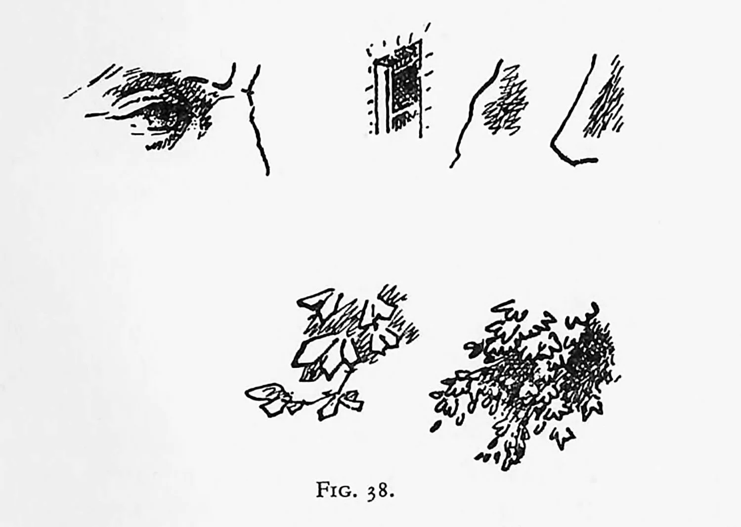 Figs. 36 and 37 illustrate such an experiment. If etching should be the chosen medium it will soon occur to the student that form must be given the prior claim. The lines that are used to translate the tonal factor of the scheme should always be less insistent than the lines that represent the form or constructive elements of the design. Every art master is continually being asked by students: “What direction should I draw these lines that represent the shadow of this object? Should I follow the forms suggested by the surface section? Should all my lines representing shadow be slanting and parallel?” These questions can only be answered by continually referring to the basis of the original sketch. If a scheme is to be translated in a linear manner—if a pencil, pen, or needle is to be used—then the significant forms that tell the story must not be interfered with or obscured by adjacent tones consisting of lines of equal significance. Tones must be tendered subordinate to forms. The diagrams in Fig. 38 give several illustrations showing the use of linear tones which at the same time keep the characteristic and essential forms dominant.