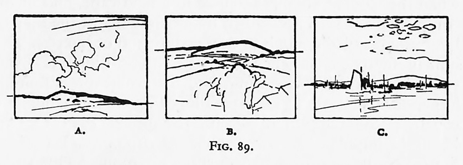 Diagrams A, B and C in Fig. 89 show three positions of this division. Apart from the question of exact proportion of sky to land, we must determine which section is to contain our chief interest. Diagram A suggests a possible proportion if the sky is to be the subject of our expression. The largest atea should, if possible, be occupied by the chief interest. The contour placed as in Diagram B will be advisable if the town or the area below the contour is our real motive.