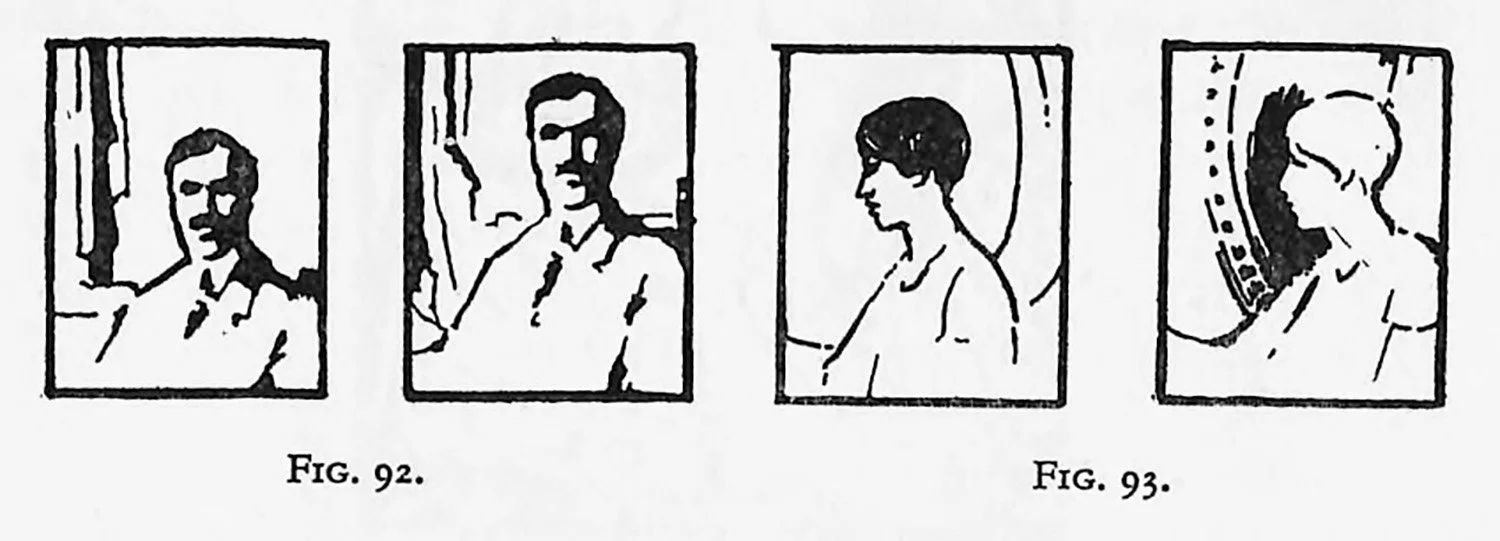 In the design of a portrait, tying the head to the top edge is, perhaps, better than having it a little too low, which gives us the sensation that the sitter is slipping down and out (Fig 92). The profile usually demands mote space in advance than behind, otherwise we give the sensation of departure on the part of the sitter (Fig. 93). So many psychological factors enter into our designs that it might be said that every idea, every picture, is best at a certain size and proportion, together with the contained shapes.