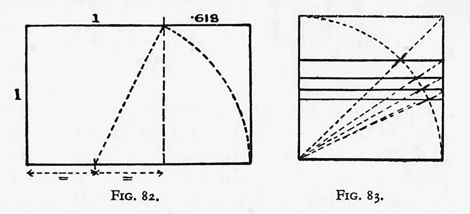 If a square and a quadrant is drawn as shown, the diagonal cuts the quadrant at a point giving a √2 rectangle on the lower portion; a diagonal from this new rectangle cuts the quadrant so that a √3 rectangle is formed below, √4 and √5 similarly follow. The resulting line divisions of √2, √3, and √5 are undoubtedly subtle, and, in consequence, useful. Another point in favour of such rectangles is the subtle proportion of the “remaining” shapes after a square-root division has been made. Fig. 83 shows this construction.