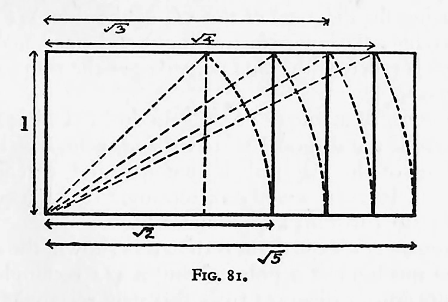 Square-root rectangles are easily described as follows: Starting from the square or “unity,” the diagonal is taken as the long side, as shown in Fig. 81. Such a rectangle is called a √2 rectangle, for the length of the long side would, if used as the side of a square, be twice the area of the original square. The same idea holds good if we use the diagonal of the √2 rectangle as the side, and we obtain a √3 rectangle, again using the diagonal of the √3 as the side. We derive a √4 rectangle (i.e. two squares long) and once again if the diagonal is taken as the side we arrive at the proportions of a √5 rectangle.