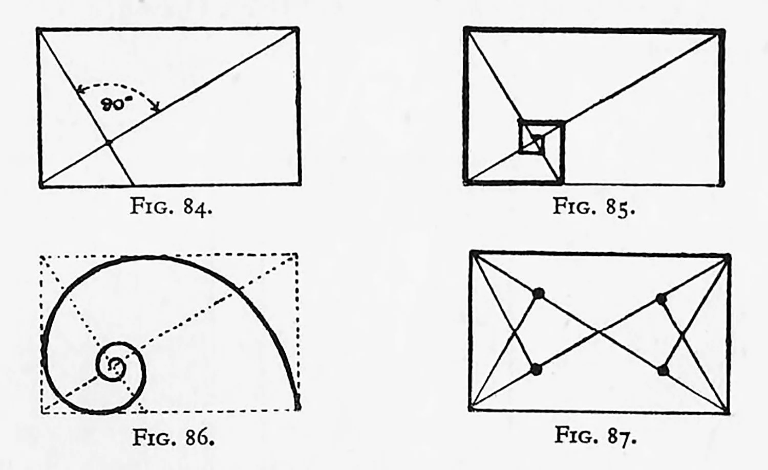 A rectangle with a diagonal and a line from an adjacent cornet cutting the diagonal at right angles, as shown in our “reciprocal rectangle problems” D and E, is given in Fig. 84. The point where the diagonal is intersected can be called the “eye” and lines parallel with the sides are drawn, which approach, but “theoretically” never teach, such a point. Such a scheme is illustrated in the shell, where the spiral line has been substituted for the cornered line (Figs. 85 and 86).