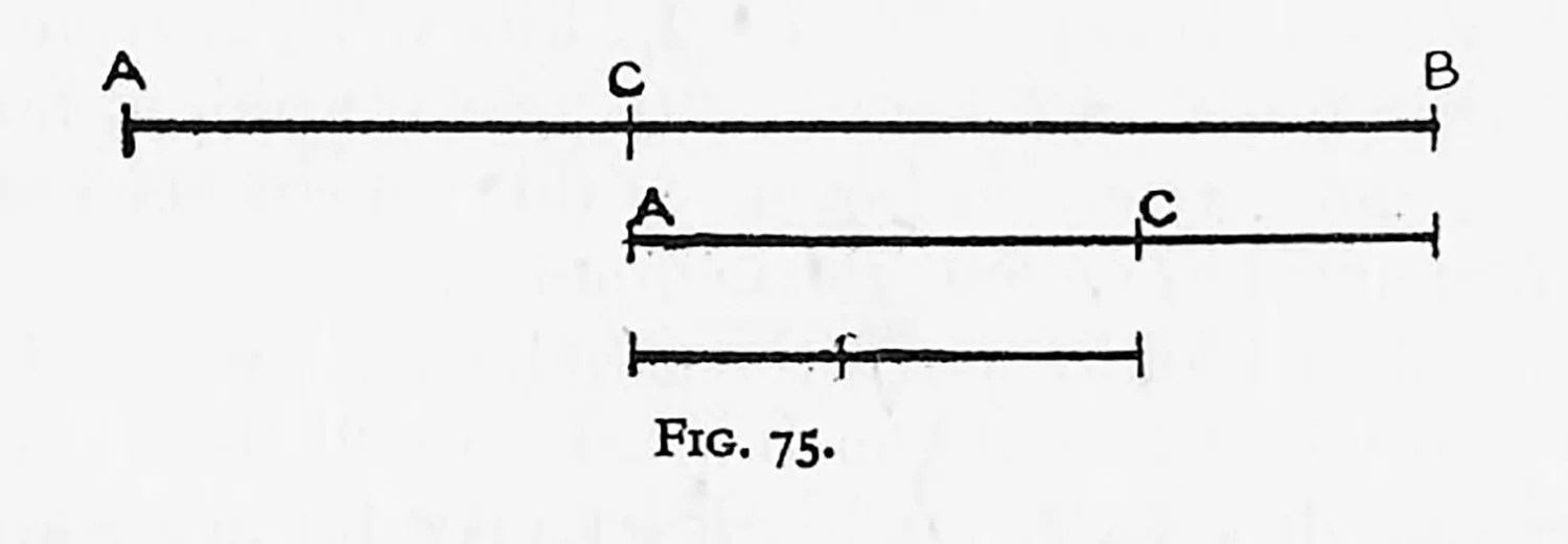 Pictures and decorations being designs on a plane surface ate more concerned with proportions of line and two-dimensional areas and their relations than with cubic content. Such works, being valueless from the utilitarian point of view, consequently possess unlimited licence in proportion. Even then a common consent as to agreeableness or otherwise of certain proportions is felt. Pythagoras was reported to have held a rod at its ends, horizontally, and asked his friends to put a mark on it in a position that gave the feeling of a satisfactory yet unequal proportion. He found, as we shall find if we experiment, a striking unanimity of opinion. The diagram, Fig. 75, shows the proportion. It seems as if we place C in such a position in order to avoid the obvious third on the left and the uncertain half on the right. Pythagoras found that by placing the length A-C on the remainder C-B the proportion remained as before. The short division, when placed on the longer, yields the same proportions to infinity. How such apparently irreconcilable proportions in line became reconciled eventually in area, how the irrational became systematized, is found in the early history of mathematics. It is certain that this proportion was used centuries before the Pythagorean incident, though probably intuitively. Yet from that time it became an intellectual concept, and after many disappearances and discoveries Kepler brought it to prominence by writing an enthusiastic dissertation on “the golden measure.”