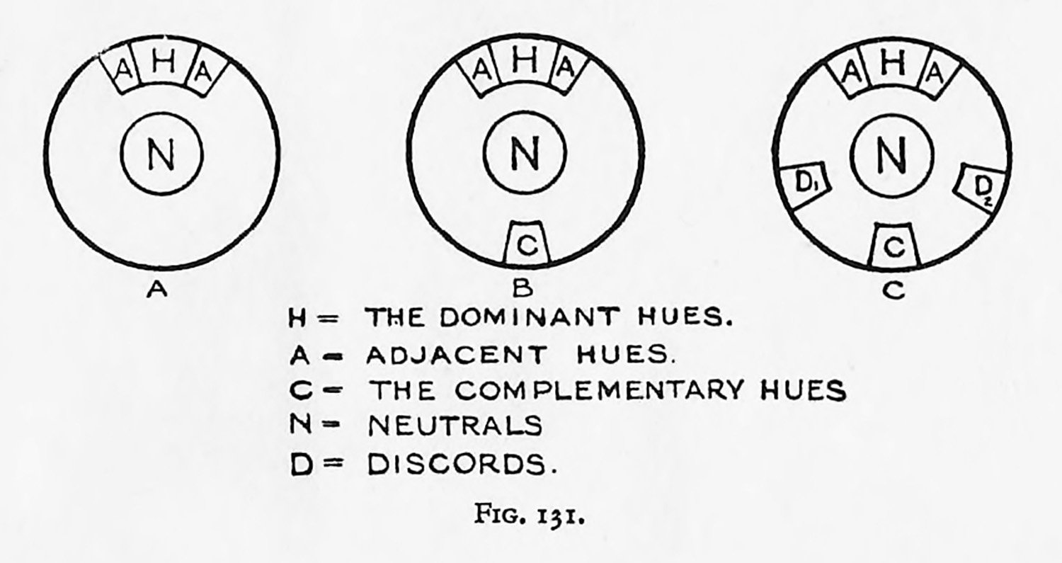 IN this chapter the term “discord” means hues that are not adjacent, or are opposed, to another given hue. If two such separated hues—say orange and purple-red—are seen side by side they disagree, or give a feeling of uneasiness. Such differences of hue do not unite or give relief, for they are neither neighbours nor opponents. Yet when such strangers enter into a colour-scheme they stimulate and challenge our colour-sense activities. If we consult the ring of hues we find that every hue has its discords, removed to a distance on either side. When the distance from the original hue is too great the discords are inclined to fuse with the opposing or contrasting hue, and again, if it is not great enough, they are inclined to unite.
