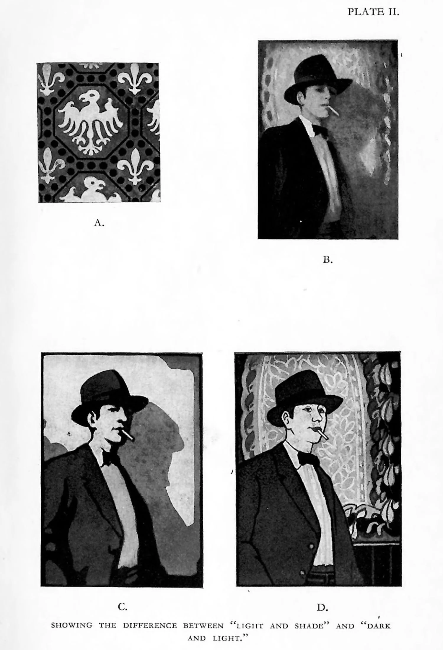 Dark and light exist in all four of the illustrations, but light and shade occur only in (B) and (C), and it should be clear that (1) “dark and light” exist in all decorations and pictures; (2) Light and shade exist in some decorations and pictures. Hence “dark and light,” owing to its inclusive character, is the real bed-rock term for any true discussion of tone in composition.