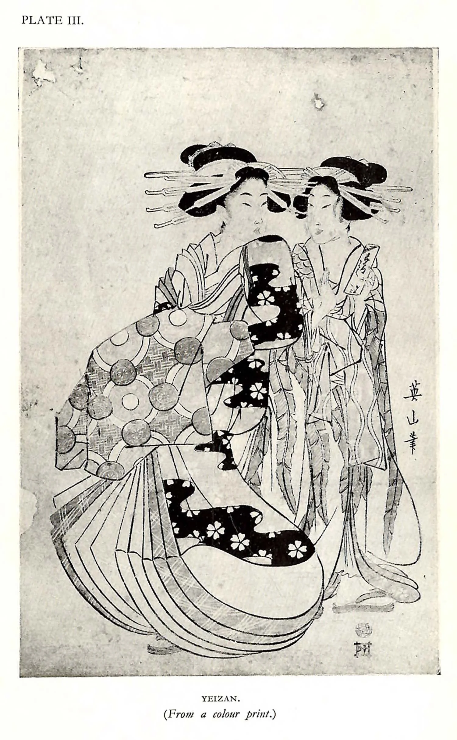 The pictorial works of the Japanese, Chinese, and, indeed, of most of the Eastern world, are confined, for the most part, to the condition implied in diagrams (A) and (D); that is to say, depth, perspective, and three-dimensional representation has been avoided. Plate III, a colour print by Yeizan, illustrates this condition.