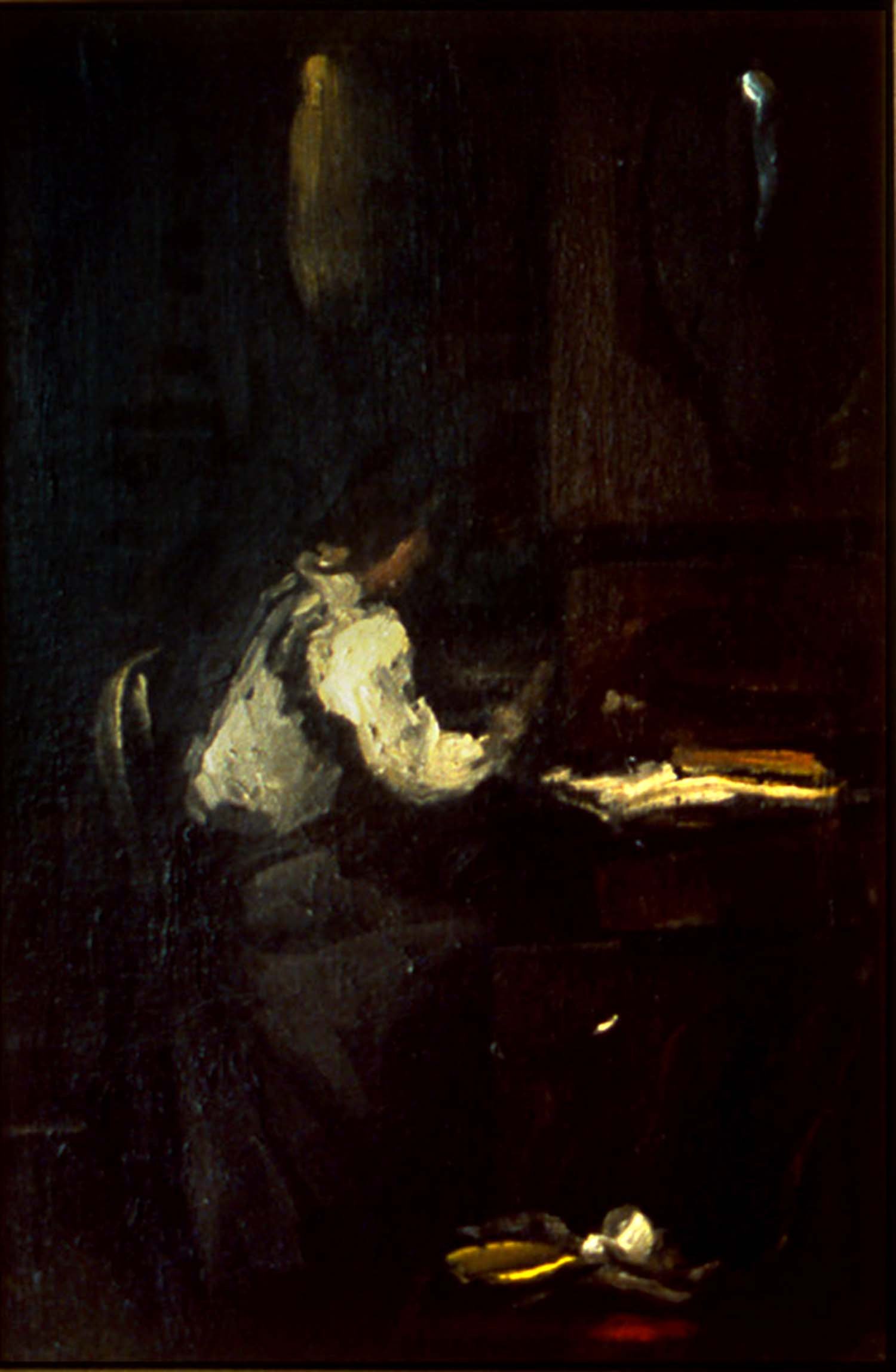 The backgrounds that are dark are very difficult to paint. That is, to make them seem like fine, breathable air. Of course it is easy to get away with a dark background, and it by its nature cannot be crude, but it can be heavy, snuffy, black.